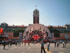 この日はまず午前9時から総統府前広場で「国慶大会」と呼ばれる記念式典が開催され、その模様はテレビで実況中継されました。陳水扁総統は式辞の中で、現在自らが最大の政治課題としている憲法改正について「台湾を正常で整備された偉大な民主国家にするために、2300万台湾人民が団結して新しい憲法をつくり出そう」と訴え、最後に「自由民主万歳、三民主義万歳、台湾人民万歳、中華民国万歳」と高唱して式辞を結びました。式典は学生や軍楽隊などのパフォーマンスも披露され、華やかに進められましたが、来年の総統選挙で政権奪回をめざす野党国民党と、国民党との協力関係を回復した宋楚瑜氏*が率いる親民党は、式典をボイコットし、南部の都市・嘉義で独自の祝賀行事を開催しました。